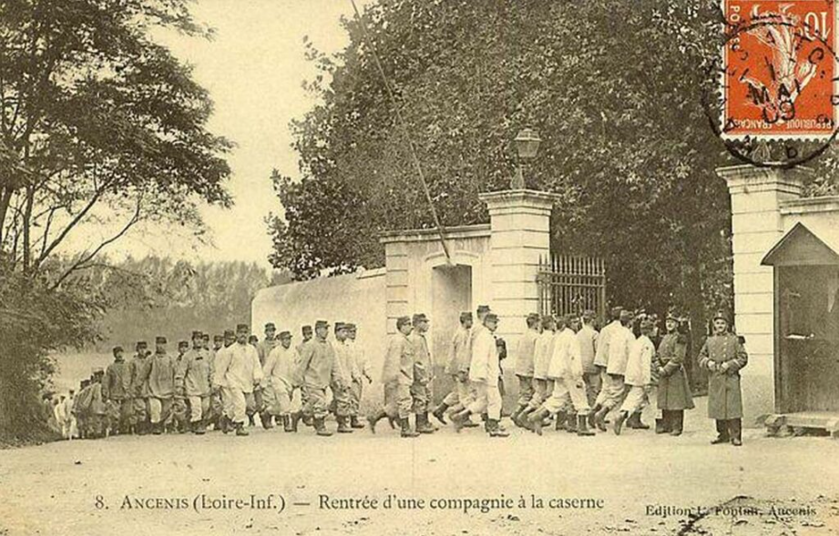 La caserne Rohan avait été, jusqu’à la Révolution, un couvent qui abritait des soeurs Ursulines, avant de devenir un quartier militaire. « Ancenis a été une ville de garnison en raison de la gare, sur la ligne Nantes-Paris, qui permettait le transport des troupes », explique Joël Thiévin. Le 64e Régiment d’Infanterie (RI) y a résidé de 1881 à 1924. Début août 1914, il comprend trois bataillons, une section de mitrailleuses par bataillon, quatre compagnies par bataillon, qui sont mobilisés. Les effectifs de la troupe sont de 3 324 soldats, répartis en 55 officiers, 199 sous-officiers, 3 125 soldats. À cela s’ajoutent 188 chevaux.