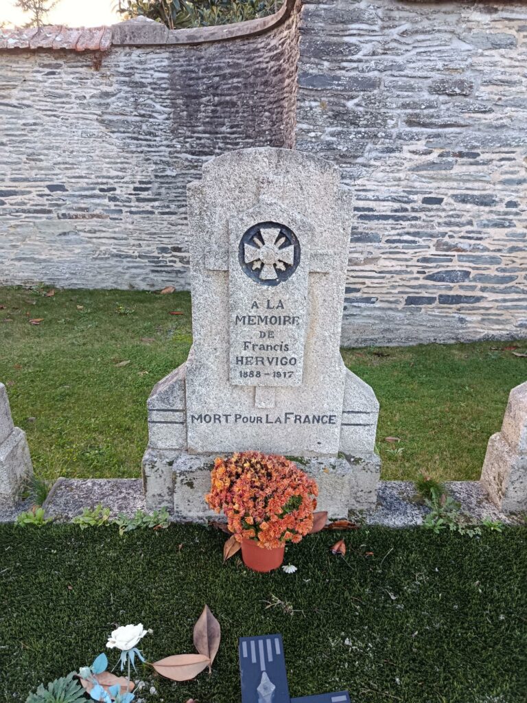 Francis HERVIGO est né le 3 avril 1888 à Ploërmel et est décédé le 11 novembre 1917 à Rouen 41, route de Neufchâtel Hôpital Aux. n° 10 des suites de ses blessures. Il a été incorporé au 116ème Régiment d’Infanterie le 3 août 1914.