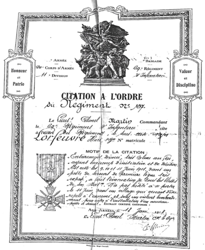 Citation à l’ordre du Régiment n°157 « Entièrement dévoué, très calme au feu, ayant beaucoup d’initiatives et de décisions, il est resté les 9-10 et 11 juin 1918 dans un poste de secours de première ligne très exposé. Il a fait l’évacuation de tous les blessés et n’a pas hésité à se porter le 11 juin dans un village qui venait d’être repris à l’ennemi sous un violent bombardement pour aider à l’installation d’un nouveau poste de secours ».