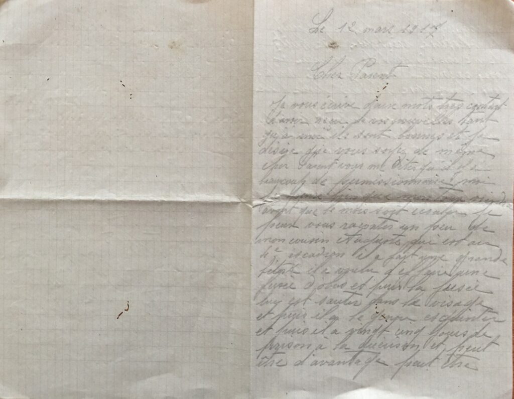 Je vous écrit deux mots, très content d'avoir reçu de vos nouvelles, tant qu'à moi, ils sont bonnes et je désire que vous soyez de même. Chers parents, vous me dites qu'il y a beaucoup de permissionnaires ; moi, je pense bien que mon tour viendra avant le mois soit fini. je peux vous raconter un peu de mon cousin Auguste qui est au 4e escadron. Il a fait une grande fête. Il a voulu défaire une fusée d'obus et puis la fusée lui a sauté au visage et puis il a eu le genou esquinté et puis il a vingt cinq jours de prison à la division et peut-être davantage, peut-être le conseil. Il n'a pas beaucoup de blessures, rien que dix-huit. Je ne connais rien de nouveau à raconter. Envoyez moi quelques sous pour que j'en ai pour aller vous voir; Je finis en vous souhaitant le bonjour aux voisins ainsi qu'à mon oncle Adrien et à ma cousine Célestine. Votre fils qui pense à vous. Désiré Pambouc