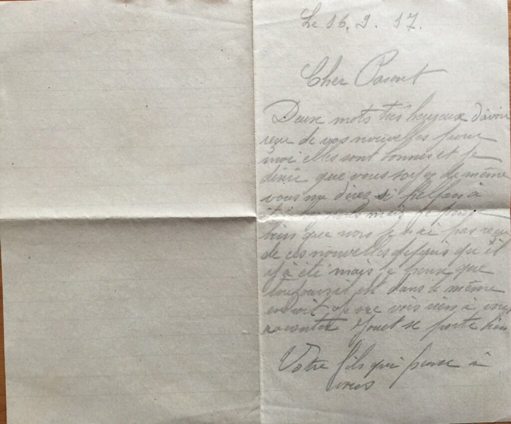 Cher Parent, Deux très heureux d’avoir reçu de vos nouvelles pour moi elles sont bonnes et je désire que vous soyez de même. Vous me disiez si Pellan a été chez nous mais je pense bien que non. Je n’ai pas reçu de ses nouvelles depuis qu’il y a été mais je pense que toujours il est dans le même endroit. Je ne vois rien à vous raconter. Jouet se porte bien.