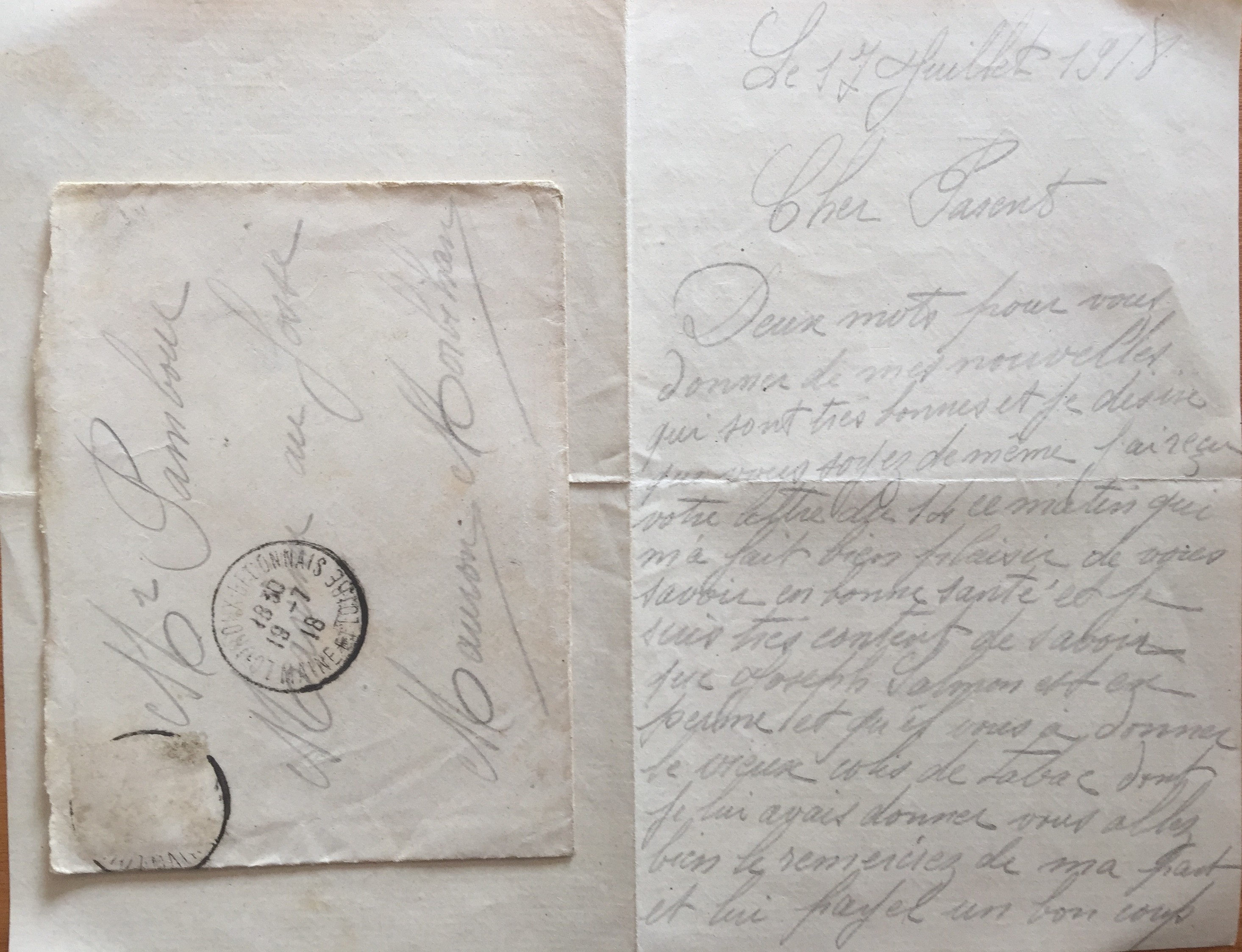 Deux mots pour vous donner de mes nouvelles qui sont très bonnes et je désire que vous soyez de même. J’ai reçu votre lettre du 14 ce matin qui m’a fait bien plaisir de vous savoir en bonne santé et je suis très content de savoir que Joseph Salmon est en perme et qu’il vous a donné le vieux colis de tabac dont je lui avais donné, vous allez bien le remercier de ma part et lui payer un bon coup à boire j’espère qu’il vous a dit où j’étais au juste et vous pourrez lui dire que même peut-être cette nuit il y a un grand coup qui va être donné où je suis maintenant et nous devons y aller à moins contrordre mais il ne faut pas vous en faire pour moi. Je suis heureux de savoir que mon copain Léon est prisonnier malheureusement mais ses parents peuvent tout de même avoir espoir dans lui à moins qu’il lui arriverait quelque chose mais enfin je ne l’espère pas. Je pourrai vous dire qu’il y a cinq minutes je viens de boire un coup avec Jouet et Pellan les grands copains du vieux pays de Mauron et de raconter se qui se passe, j’ai vu le bulletin et j’ai vu la citation de Léon Godreul mais ses deux jours de perme il les a passé en Allemagne mais si vous avez l’occasion de voir son frère vous lui souhaiterez le bonjour et lorsqu’il écrira à Léon il en fera autant pour faire plaisir à mon parrain, vous pourrez lui donner un peu de tabac si ça vous fait plaisir. J’ai reçu vos cinq francs et vous remercie beaucoup. Je ne vois rien à vous dire, je finis en pensant à vous. Votre fils, Désiré Pambouc.