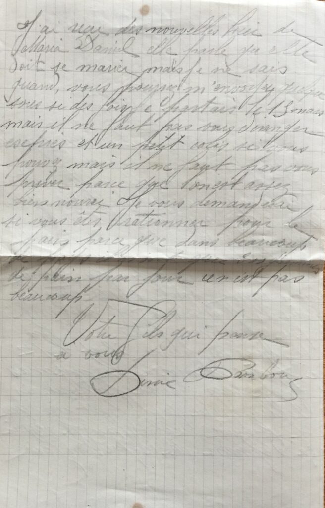 Deux mots très heureux d’avoir reçu de vos bonnes nouvelles tant qu’à moi la santé est très bonne aussi et je désire que ma lettre vous trouve de même. Aujourd’hui le temps à changé il a tombé un peu d’eau. Les avions boches n’ont pas pu venir nous rendre visite sans ça tous les soirs qu’ils viennent. Je vous dirai que Jouet partira en perme à la fin du mois, il est le 1er à partir et moi à la mi-mars. Je ne sais pas si j’attendrais Pellan parce qu’il part rien que le premier avril enfin je verrai ça dépendra de ce que l’on fera. J’ai reçu des nouvelles hier de Maria Daniel, elle parle qu’elle doit se marier mais je ne sais pas quand, vous pouvez m’envoyer quelques sous si des fois je partais le 15 mars mais il ne faut pas vous dérangez exprès et un petit colis si vous pouvez mais il ne faut pas vous priver parce que l’on est assez bien nourri. Je vous redemanderai si vous êtes rationnés pour le pain parce que dans beaucoup de pays ils n’ont que 300 grammes de pain par jour ce n’est pas beaucoup.