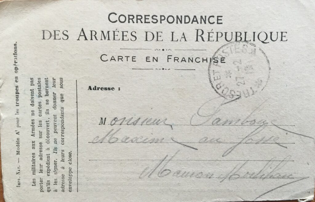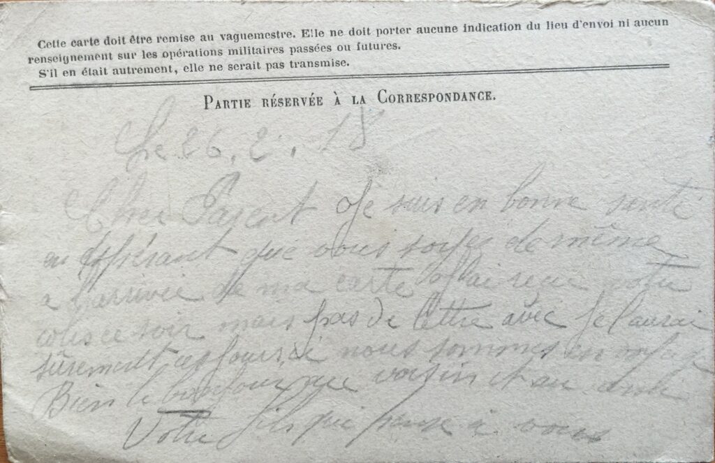 Cher Parent, je suis en bonne santé en espérant que vous soyez de même à l’arrivée de ma lettre. J’ai reçu votre colis ce soir mais pas de lettre avec. Je l’aurai sûrement ces jours ci, nous sommes en voyage.