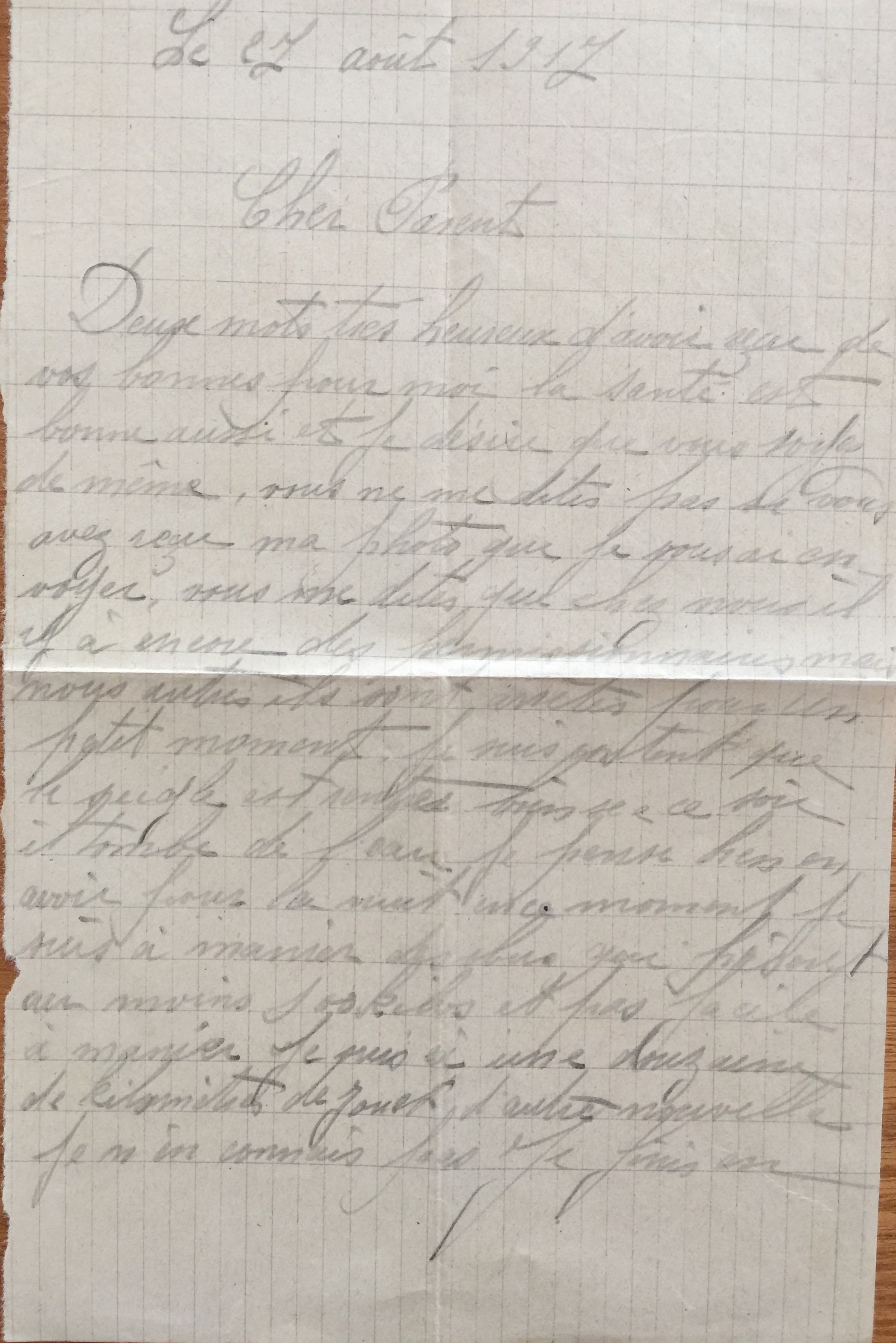 Deux mots très heureux d’avoir reçu de vos bonnes pour moi la santé est bonne aussi. Vous ne me dîtes pas que vous avez reçu ma photo que je vous ai envoyée. Vous me dites que chez vous il y a encore des permissionnaires mais nous autres ils sont arrêtés pour un petit moment. Je suis content que le seigle est bien rentré bien que ce soir il tombe de l’eau je pense bien en avoir pour la nuit en ce moment je suis à manier des obus qui pèsent au moins 100 kilos et pas facile à manier. Je suis à une douzaine de kilomètres de Jouet. D’aitres nouvelles je n’en connais pas, je finis en pensant toujours à vous. Votre fils qui vous embrasse de loin au plaisir de le faire de près.