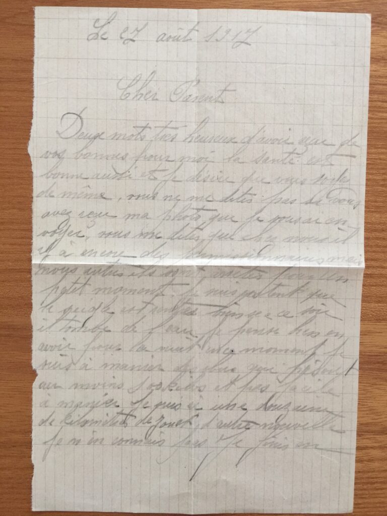 Deux mots très heureux d’avoir reçu de vos bonnes pour moi la santé est bonne aussi. Vous ne me dîtes pas que vous avez reçu ma photo que je vous ai envoyée. Vous me dites que chez vous il y a encore des permissionnaires mais nous autres ils sont arrêtés pour un petit moment. Je suis content que le seigle est bien rentré bien que ce soir il tombe de l’eau je pense bien en avoir pour la nuit en ce moment je suis à manier des obus qui pèsent au moins 100 kilos et pas facile à manier. Je suis à une douzaine de kilomètres de Jouet. D’aitres nouvelles je n’en connais pas, je finis en pensant toujours à vous. Votre fils qui vous embrasse de loin au plaisir de le faire de près.