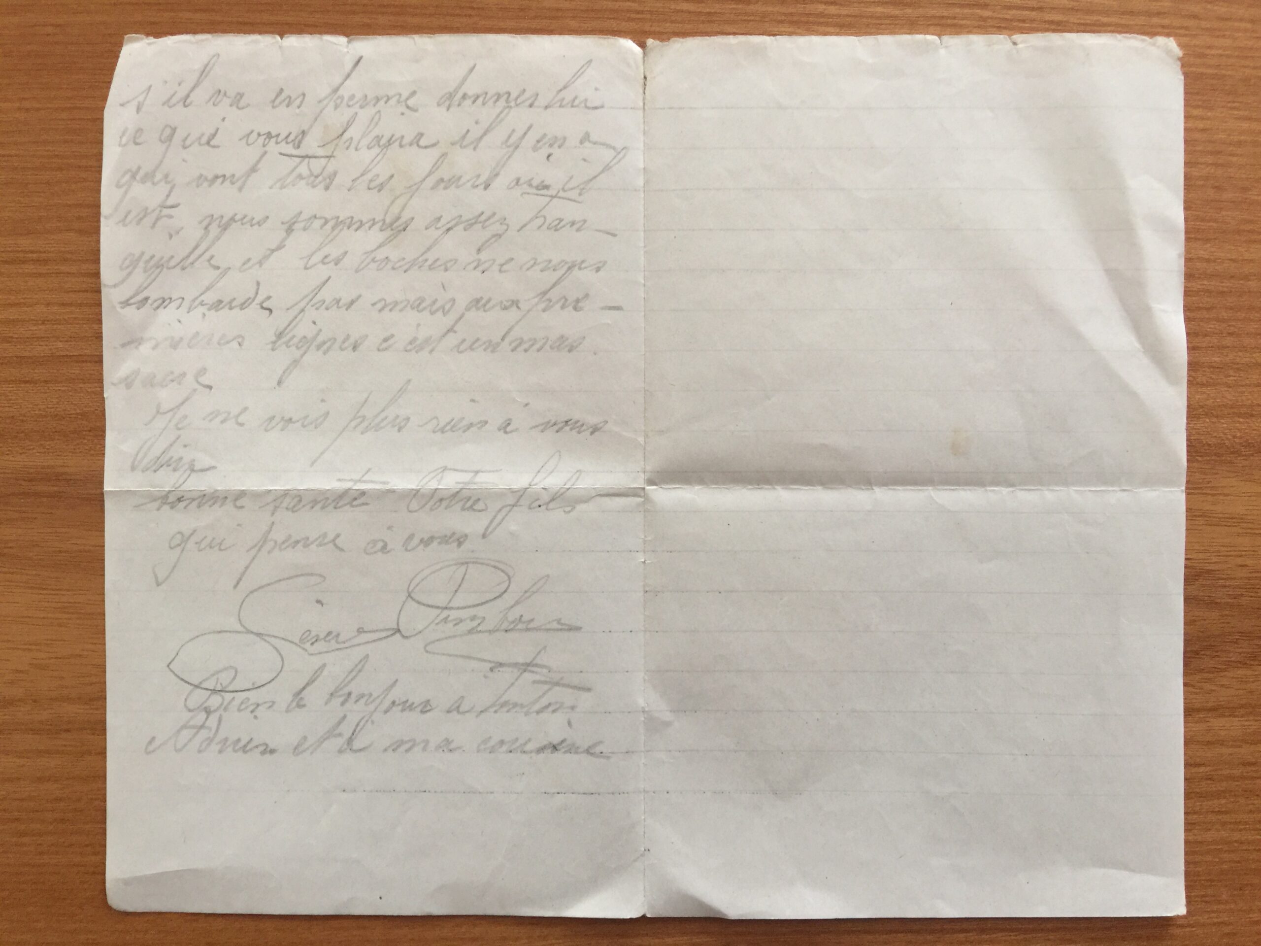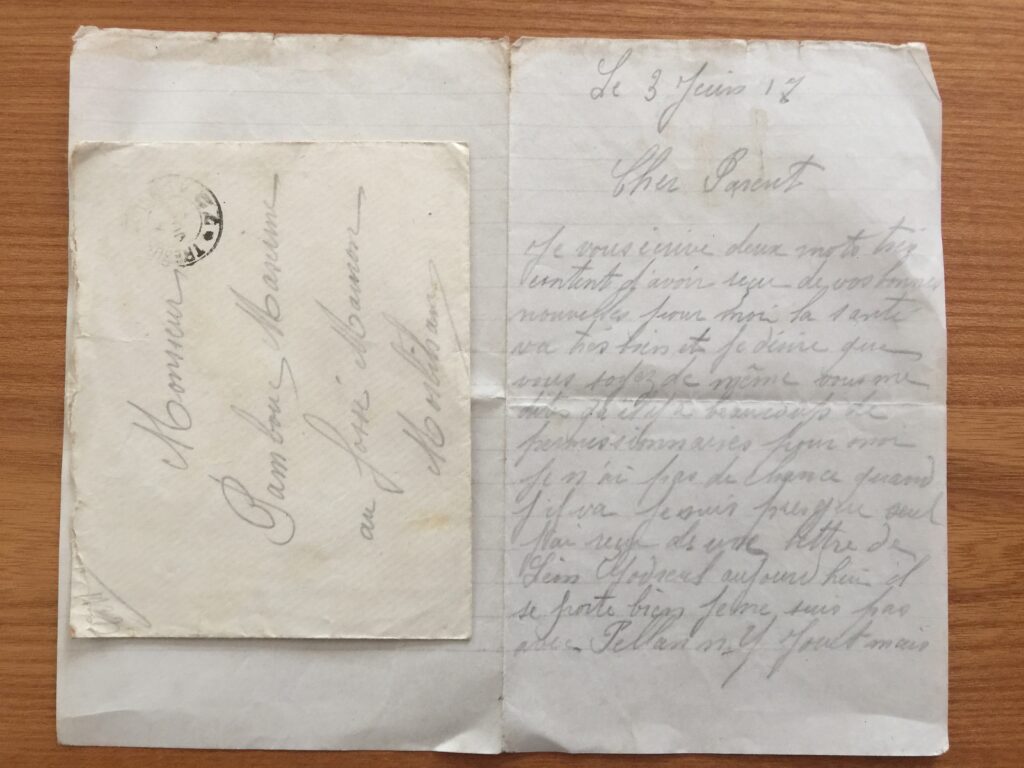 Cher Parent, je vous écrive deux mots très contents d’avoir reçu de vos bonnes nouvelles pour moi la santé va très bien et je désire que vous soyez de même. Vous me dîtes qu’il y a beaucoup de permissionnaires, pour moi je n’ai pas de chance quand j’y va. Je suis presque seul, j’ai reçu une lettre de Léon Godreul aujourd’hui, il se porte bien je ne suis pas avec Pellan ni Jouet mais s’il va en perme donnes lui ce qui vous plaira, il y en a qui vont tous les jours qu’il est. Nous sommes assez tranquilles et les boches ne nous bombardent pas mais aux premières lignes c’est un massacre. Je ne vois plus rien à vous dire, bonne santé. Votre fils qui pense à vous.