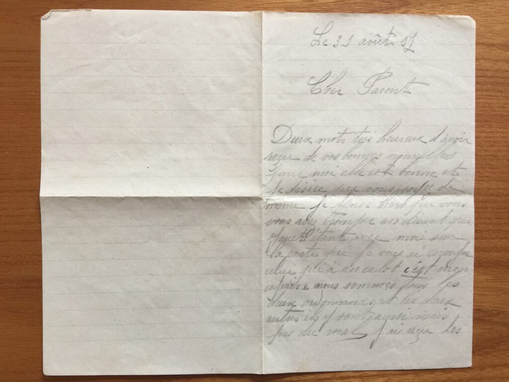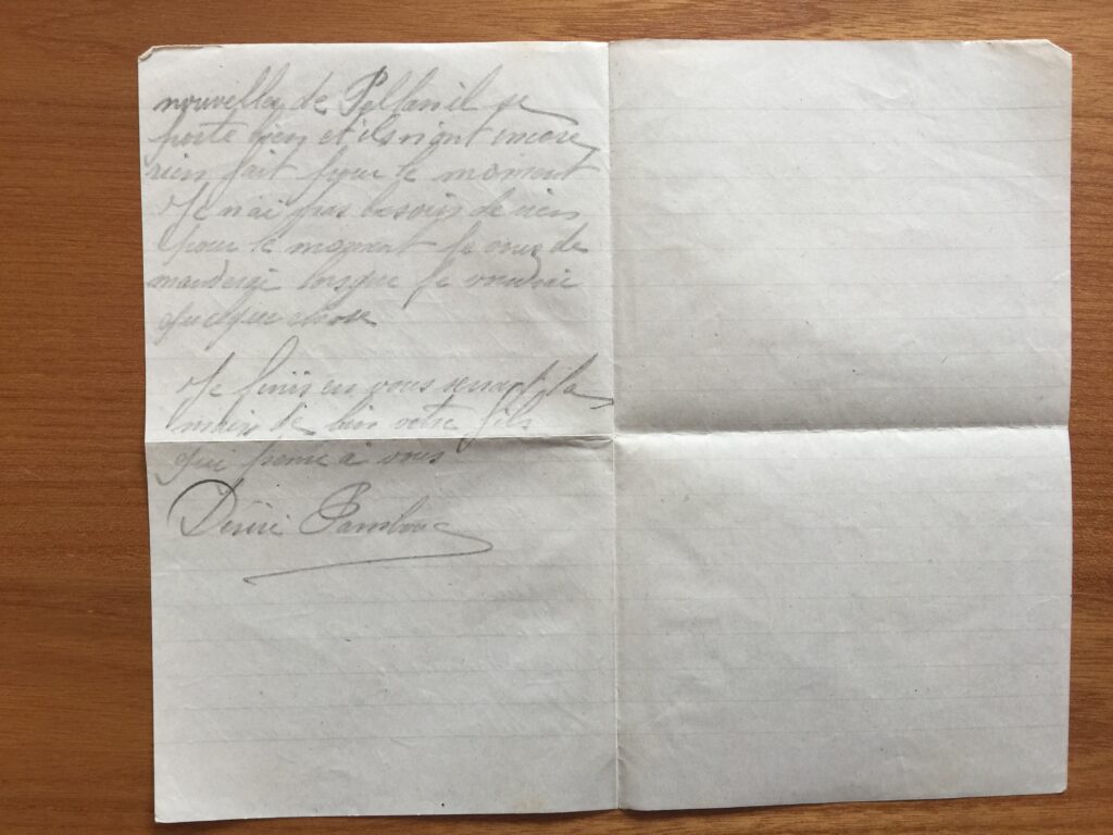 Deux mots très heureux d’avoir reçu de vos bonnes nouvelles pour moi elle est bonne et je désire que vous soyez de même. Je pense bien que vous vous êtes trompé en disant que Jouet étant avec moi sur la carte que je vous ai envoyée, celui qui a un calot est mon copain et nous sommes tous les deux ordonnances et les deux autres y sont aussi mais pas du mal, j’ai reçu les nouvelles de Pellan, il se porte bien et ils n’ont encore rien fait pour le moment. Je n’ai pas besoin de rien pour le moment je vous demanderai lorsque je voudrai quelque chose. Je finis en vous serrant la main de loin votre fils qui pense à vous.