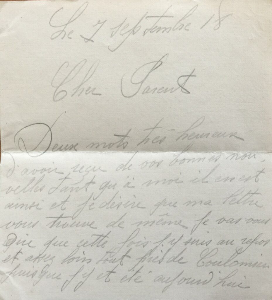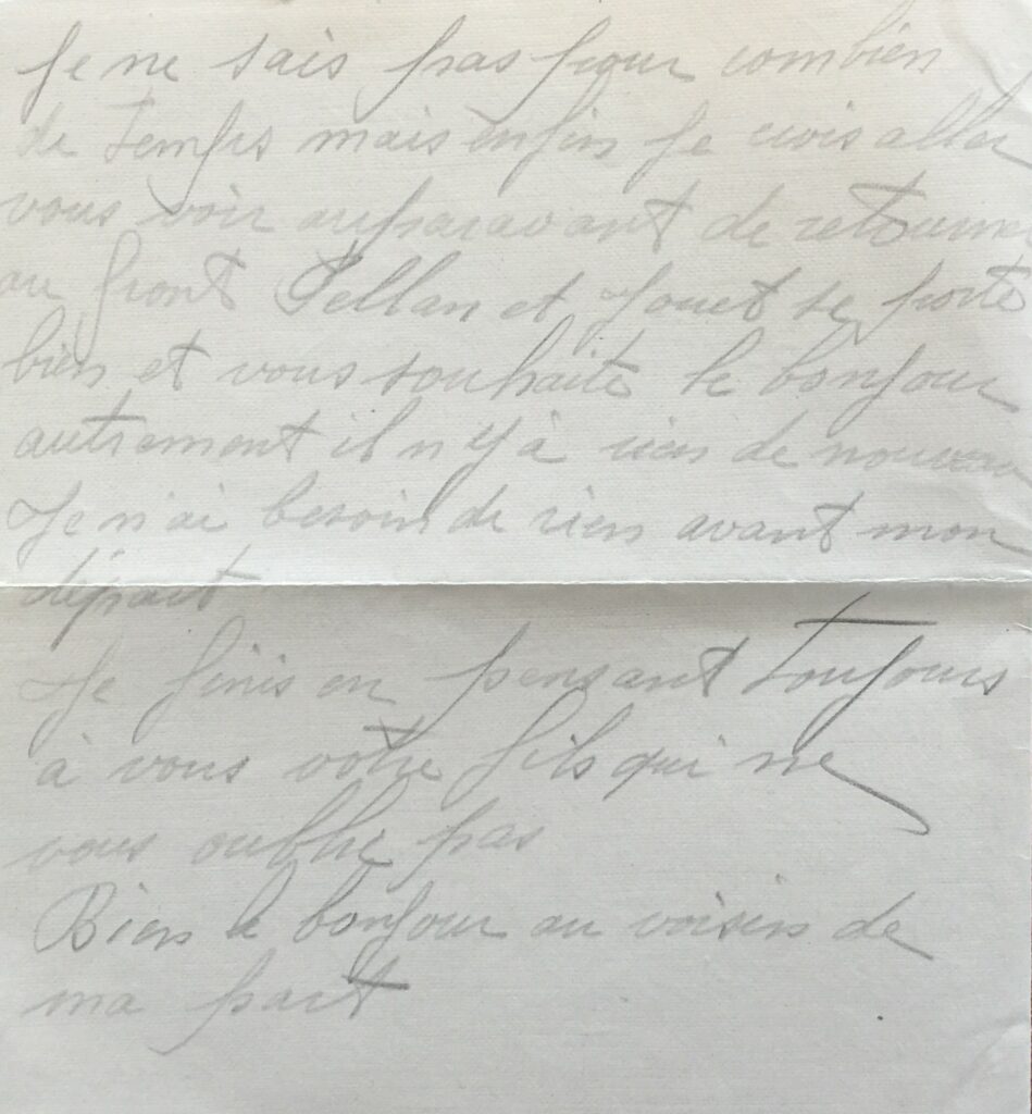 Deux mots très heureux d’avoir reçu de vos bonnes nouvelles tant qu’à moi il en est ainsi et je désire que ma lettre vous trouve de même. Je vas vous dire que cette fois j’y suis au repos et assez loin tout près de Coulommiers puisque j’y ai été aujourd’hui je ne sais pas pour combien de temps mais enfin je crois aller voir auparavant de retourner au front. Pellan et Jouet se portent bien et vous souhaite le bonjour. Autrement il n’y a rien de nouveau. Je n’ai besoin de rien avant mon départ. Je finis en pensant toujours à vous, votre fils qui ne vous oublie pas.