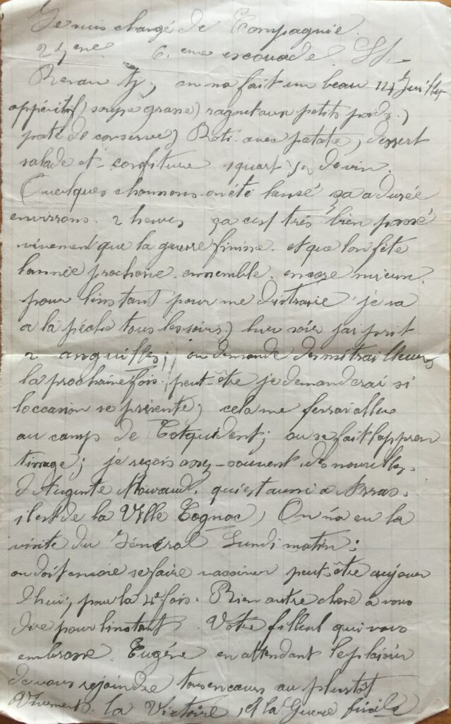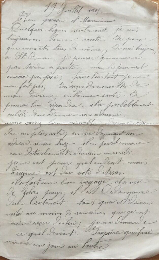 Chers Parrain et Marraine, Quelques lignes seulement, je suis toujours en bonne santé. Je pense que vous êtes tous de même, je suis toujours à Saint Renan. Je pense qu’on ne va pas tarder à partir, mais le jour n’est pas encore fixé ; pour l’instant je ne m’en fait pas. J’ai reçu des nouvelles de mon cousin ; en bonne santé. Je pensais lui répondre, il a probablement oublié de me donner son adresse. Vous serez bien aimables de me répondre au plus vite en me donnant son adresse si vous l’avez. Il part encore un détachement un détachement demain mercredi. Je ne sais pour quel endroit mais Eugène est du côté d’Arras. Il a fait un bon voyage et a vu de jolis pays. Il est ordonnance d’un lieutenant. Voilà au moins 6 semaines que je n’ai rien reçu de lui. Je me demande ce qu’il devient.. j’espère qu’il m’écrira un jour ou l’autre. Je suis chargé de compagnie 24ème – 6ème escouade. On a fait un beau 14 juillet : Apéritif, soupe grasse, ragout aux petits pois, pâté de conserve, rôti aux patates, dessert, salade et confiture, un quart de vin, quelques chansons ont été dansées, ça a duré environ 2 heures, ça s’est très bien passé, vivement que la guerre finisse et qu’on fête l’année prochaine ensemble encore mieux pour l’instant pour me distraire je vais à la pêche tous les soirs. Hier soir j’ai pris des anguilles. On demande des mitrailleurs la prochaine fois, peut-être je demanderai si l’occasion se présente, cela me ferai aller au camp de Coëtquidan. Je reçois assez souvent des nouvelles d’Auguste Mouraud qui est aussi à Arras. Il est de la ville Cognac, on a eu la visite du général lundi matin, on doit se faire vacciner peut-être aujourd’hui, ce sera la 4ème fois. Rien d’autres choses à vous dire pour l’instant. Votre filleul qui vous embrasse. Eugène, en attendant le plaisir de vous rejoindre tous au plus tôt. Vivement la victoire et la guerre finie.