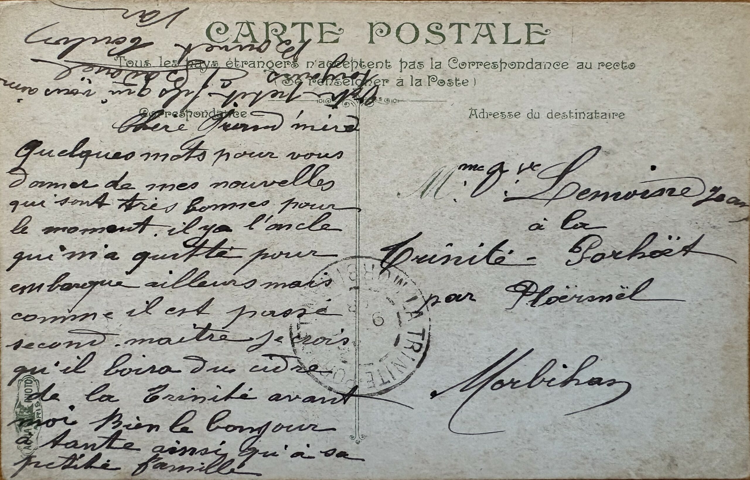 Quelques mots pour vous donner de mes nouvelles qui sont très bonnes pour le moment. Il y a l’oncle qui m’a quitté pour embarquer ailleurs, mais comme il est passé second-maître je crois qu’il boira du cidre de la Trinité avant moi.