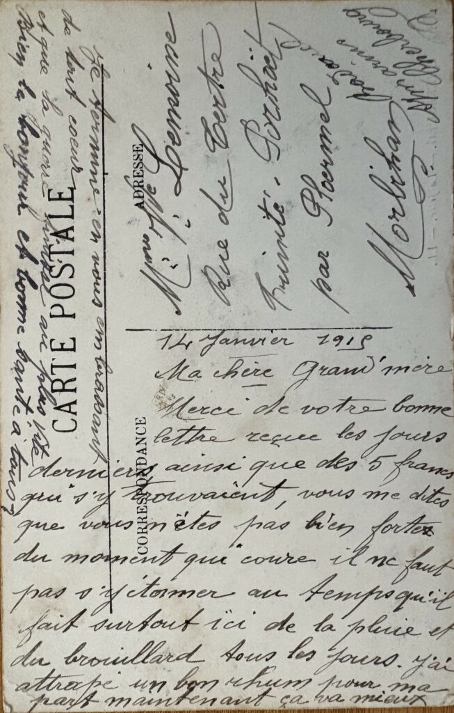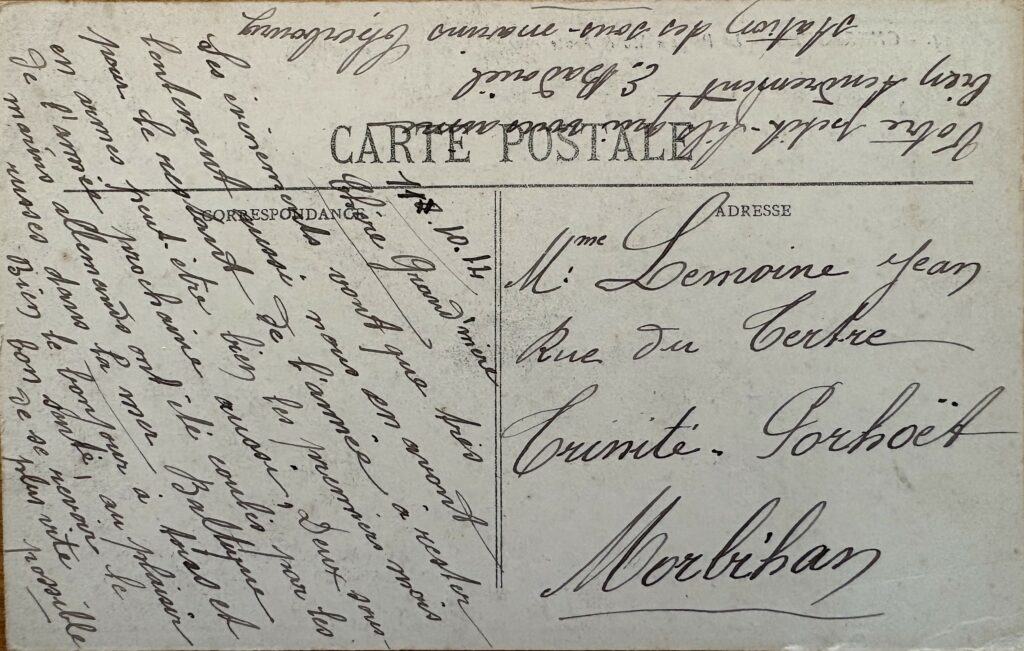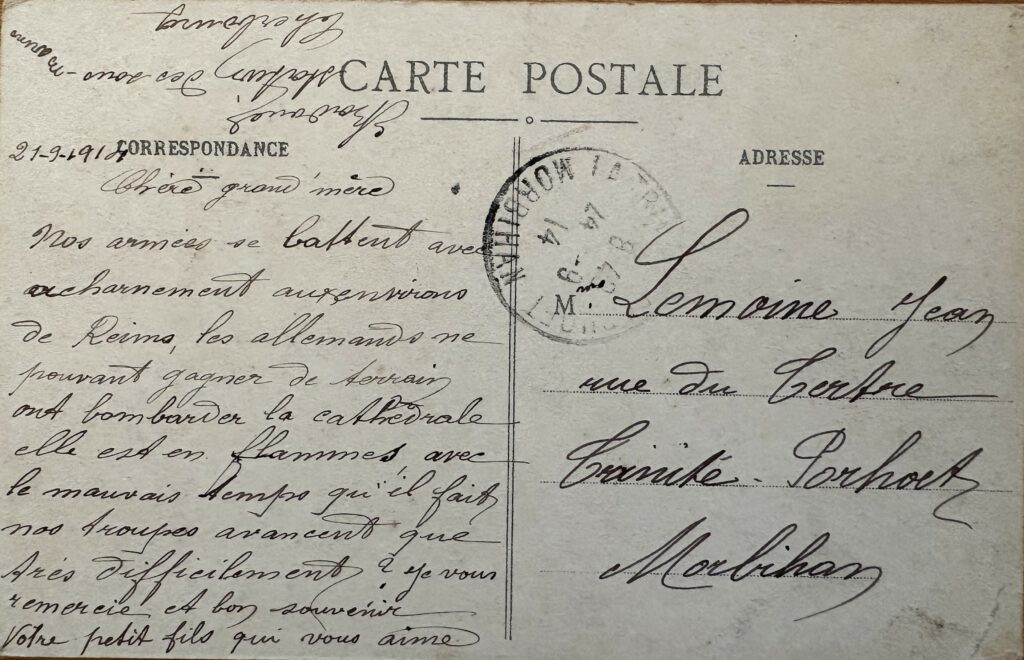 Cherbourg (Manche), 21 septembre 1914. Chère grand-mère, Nos armées se battent avec acharnement aux environs de Reims. Les Allemands ne pouvant gagner de terrain, ont bombardé la cathédrale. Elle est en flammes ; avec le mauvais temps qu’il fait, nos troupes n’avancent que très difficilement. Je vous remercie et bon souvenir. Votre petit-fils qui vous aime.