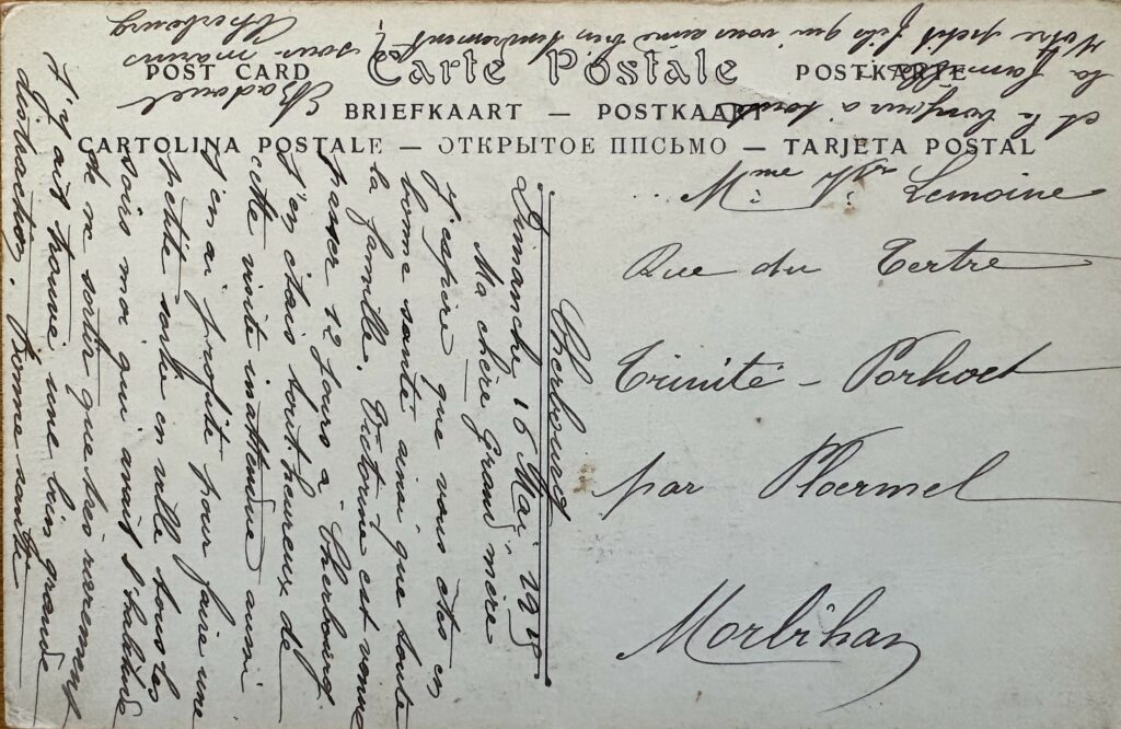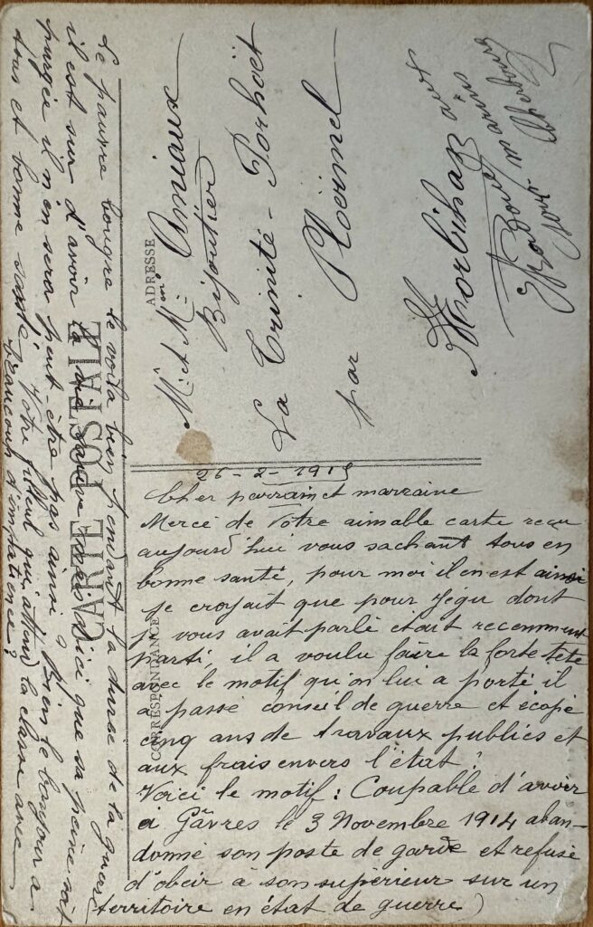 Merci pour votre aimable carte reçue aujourd’hui vous sachant tous en bonne santé ; pour moi, il en est ainsi. je croyais que pour Jégu dont on avait parlé était récemment parti. Il a voulu faire la forte tête avec le motif qu’on lui a porté, il est passé au conseil de guerre et écopé de cinq ans de travaux publics et aux frais de l’Etat. Voici le motif; Coupable d’avoir à Gâvres, le 3 Novembre 1914, abandonner son poste de garde et refuser d’obéir à son supérieur sur un territoire en temps de guerre.