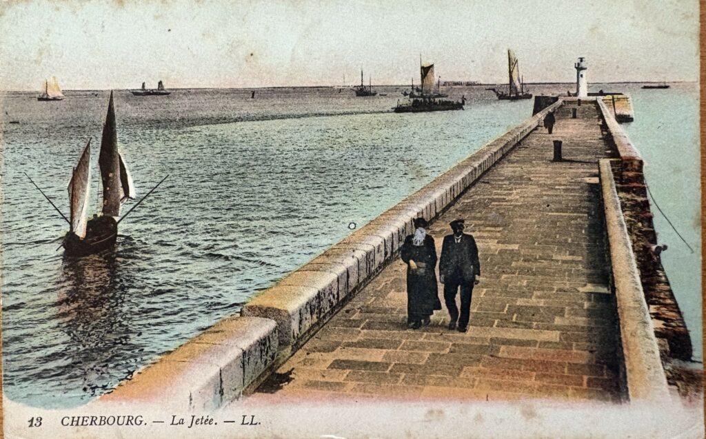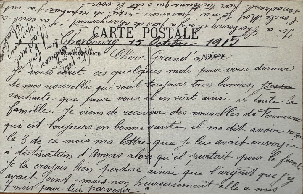 J’espère que vous êtes en bonne santé ainsi que toute la famille. Victorine est venue passer 12 jours à Cherbourg. J’en étais tout heureux de cette visite inattendue ; aussi, j’en ai profité pour faire une petite visite en ville tous les soirs, moi qui avais l’habitude de ne sortir que très rarement. j’y ai trouvé une bien grande distraction. Bonne santé et le bonjour à toute la famille. Votre petit fils qui vous aime très tendrement.