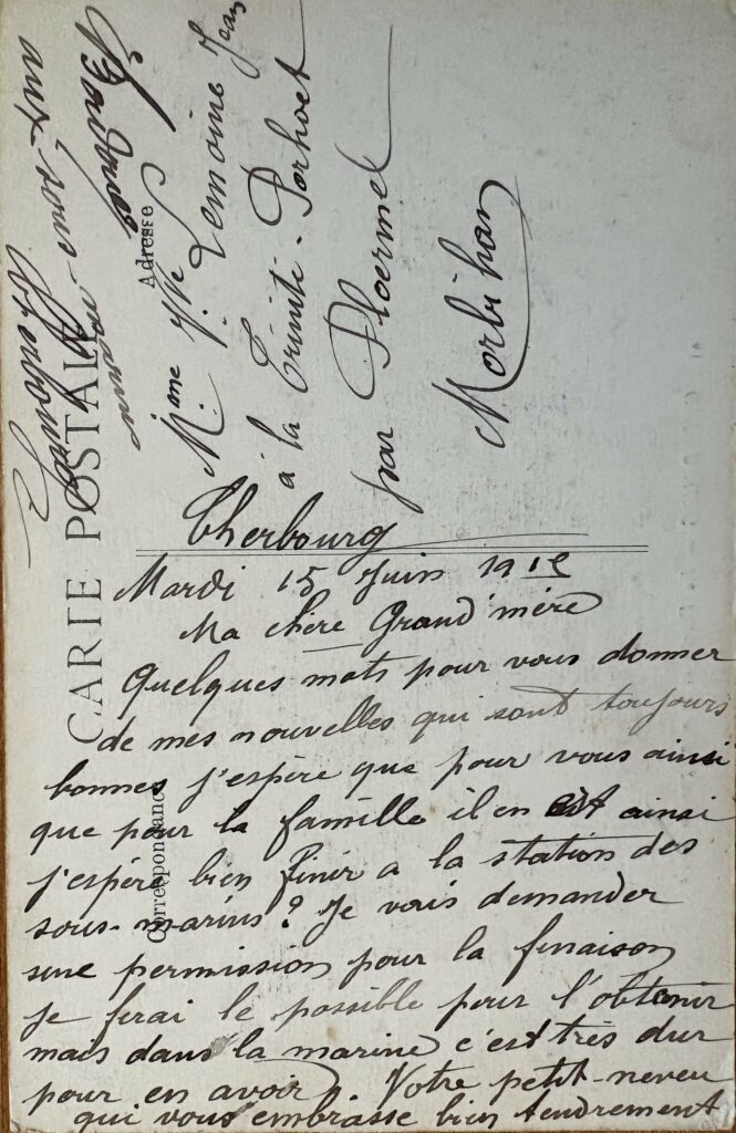 Cherbourg (Manche), le 15 février 1915. Chers Parrain et Marraine, Quelques mots pour vous donner de mes nouvelles qui sont très bonnes, j’espère qu’il en est ainsi pour toute la famille. Je vous ai demandé si vous connaissiez un nommé : Victor JÉGU, fils de François et Anne-Marie AUDO né le 4 octobre 1886, domicilié actuellement à BASSE-INDRE en LOIRE-INFÉRIEURE. Il est marin de 3ème classe sans spécialité. Si vous connaissez ça, je pourrais vous en dire quelque chose. Si les parents étaient à la Trinité, ne leur parler de rien. Au revoir et bonne santé – Station Sous-Marin – Cherbourg.