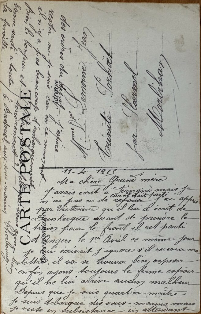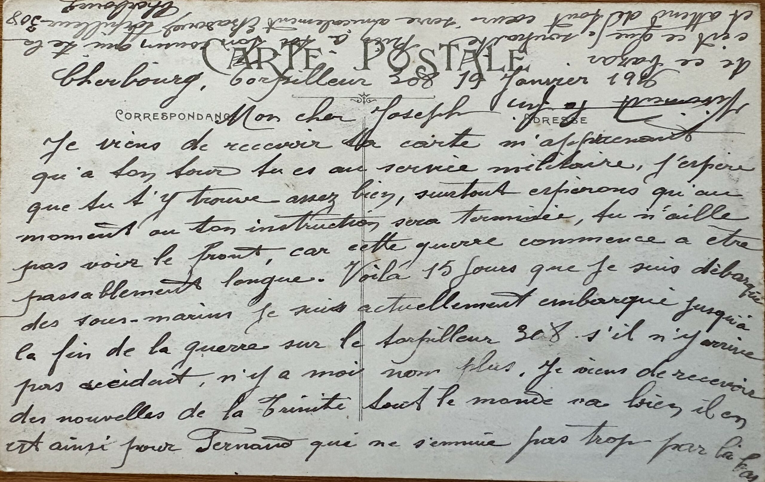 Je viens de recevoir ta carte m’apprenant qu’à ton tour, tu es au service militaire. j’espère que tu t’y trouve assez bien ; surtout, espérons qu’au moment de ton instruction sera terminée, tu n’ailles pas voir le front car cette guerre commence à être passablement longue. Voilà 15 jours que je suis débarqué des sous-marin. je suis actuellement embarqué jusqu’à la fin de la guerre sur le torpilleur 308s’il n’y lui arrive pas d’accident, n’y a moi non plus. je viens de recevoir des nouvelles de la Trinité ; tout le monde va bien, il est ait ainsi pour Fernand qui ne s’ennuie pas trop par là-bas.