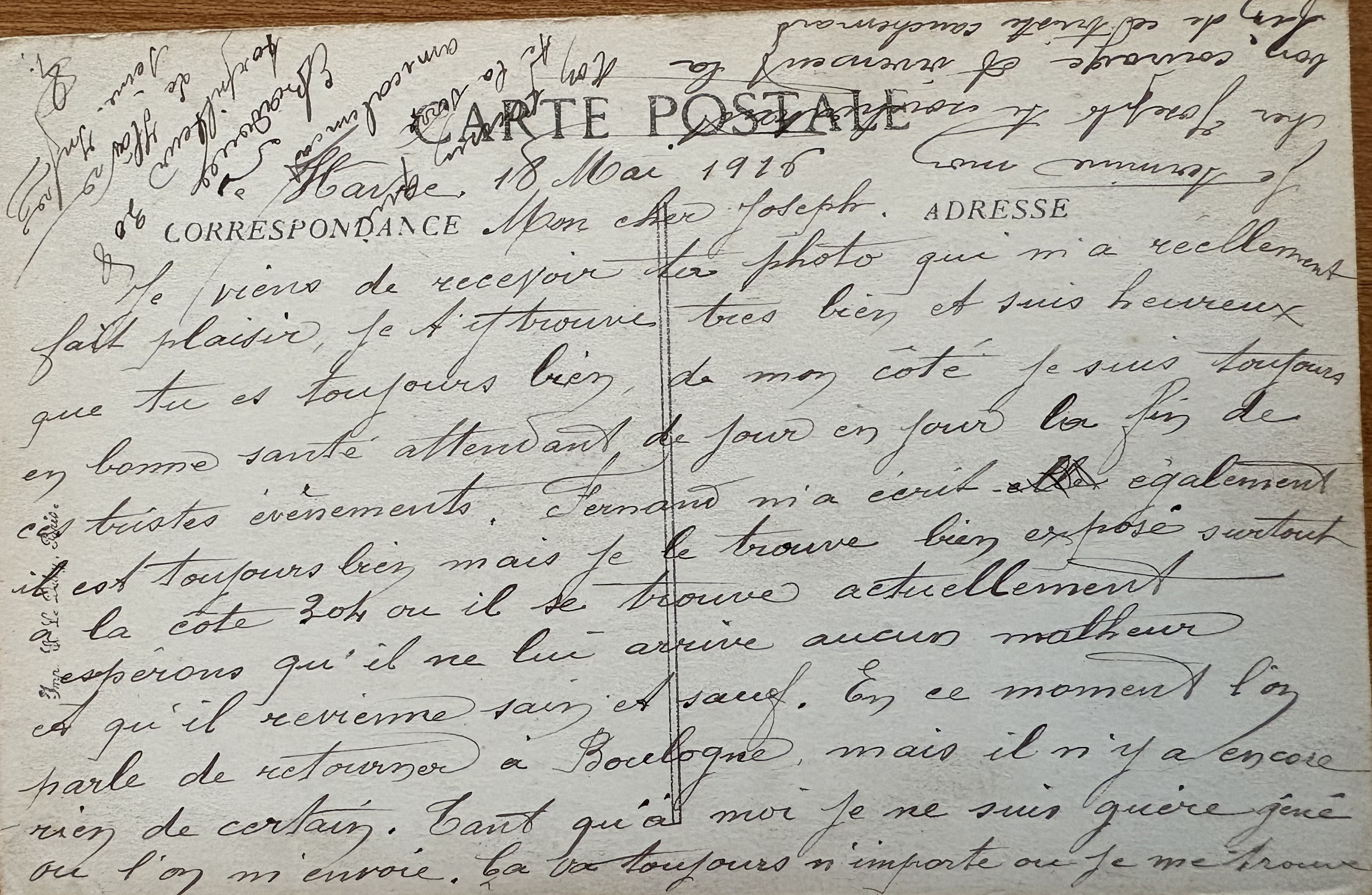Je viens de recevoir ta photo qui m’a réellement fait plaisir, je t’y trouve très bien et suis heureux que tu es toujours bien. De mon côté, je suis toujours en bonne santé attendant de jour en jour la fin de ces tristes événements. Fernand m’écrit également, il est toujours bien mais je le trouve bien exposé surtout à la côte 304 où il se trouve actuellement. Espérons qu’il ne lui arrive aucun malheur et qu’il revienne sain et sauf. En ce moment, l’on parle de retourner à Boulogne mais il n’y a encore rien de certain. Tant qu’à moi, je ne suis guère gêné où l’on m’envoie ; ça va toujours n’importe où je me trouve. je termine mon cher Joseph, bon courage.