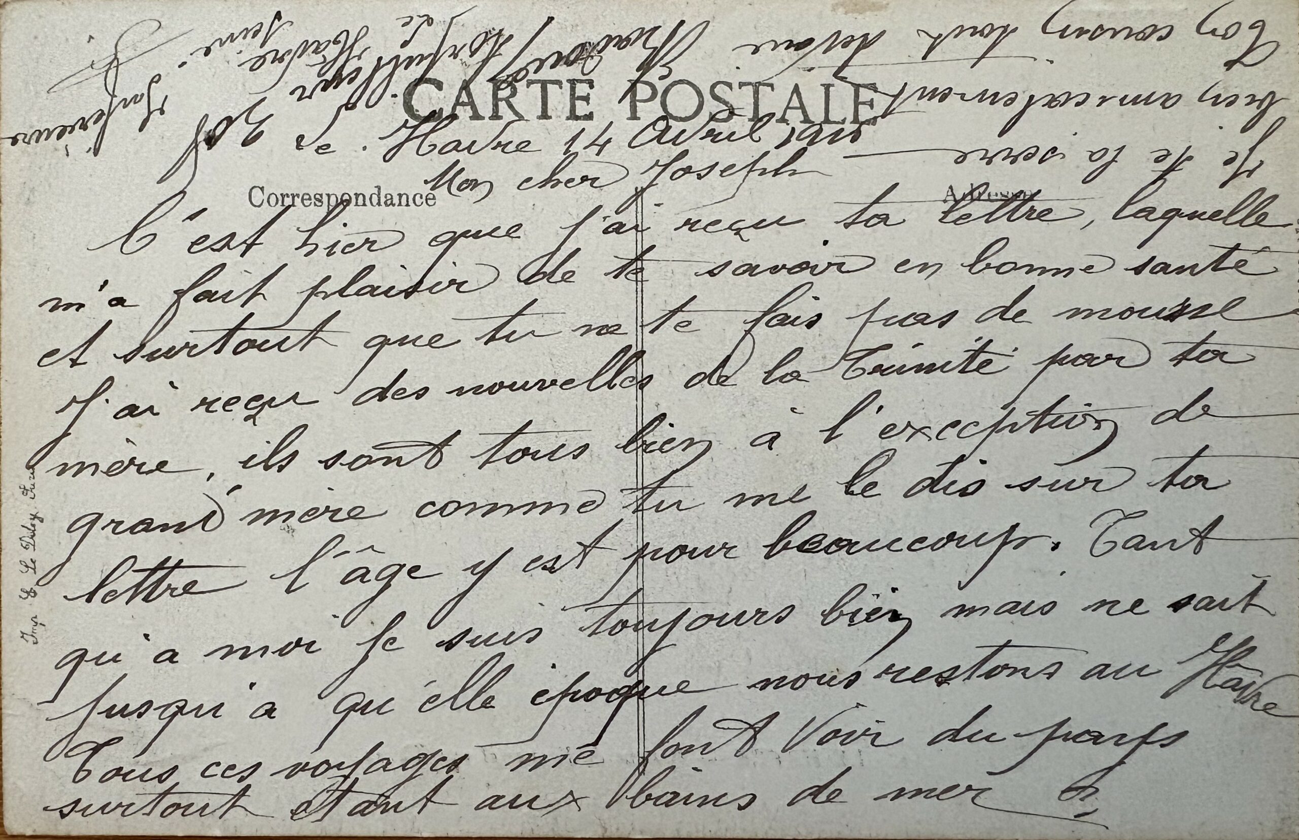 C’est hier que j’ai reçu ta lettre, laquelle m’a fait plaisir de te savoir en bonne santé et surtout que tu ne fais pas de mousse. j’ai reçu des nouvelles de la Trinité par ta mère. Ils sont tous bien à l’exception de grand-mère comme tu me le dis sur ta lettre. l’âge y est pour beaucoup. Tant qu’à moi, je suis toujours bien mais ne sait jusqu’à quelle époque nous restons au Havre. Tous ces voyages me font voir du pays surtout étant aux bains de mer. Je te la serre bien amicalement. Ton cousin tout dévoué.