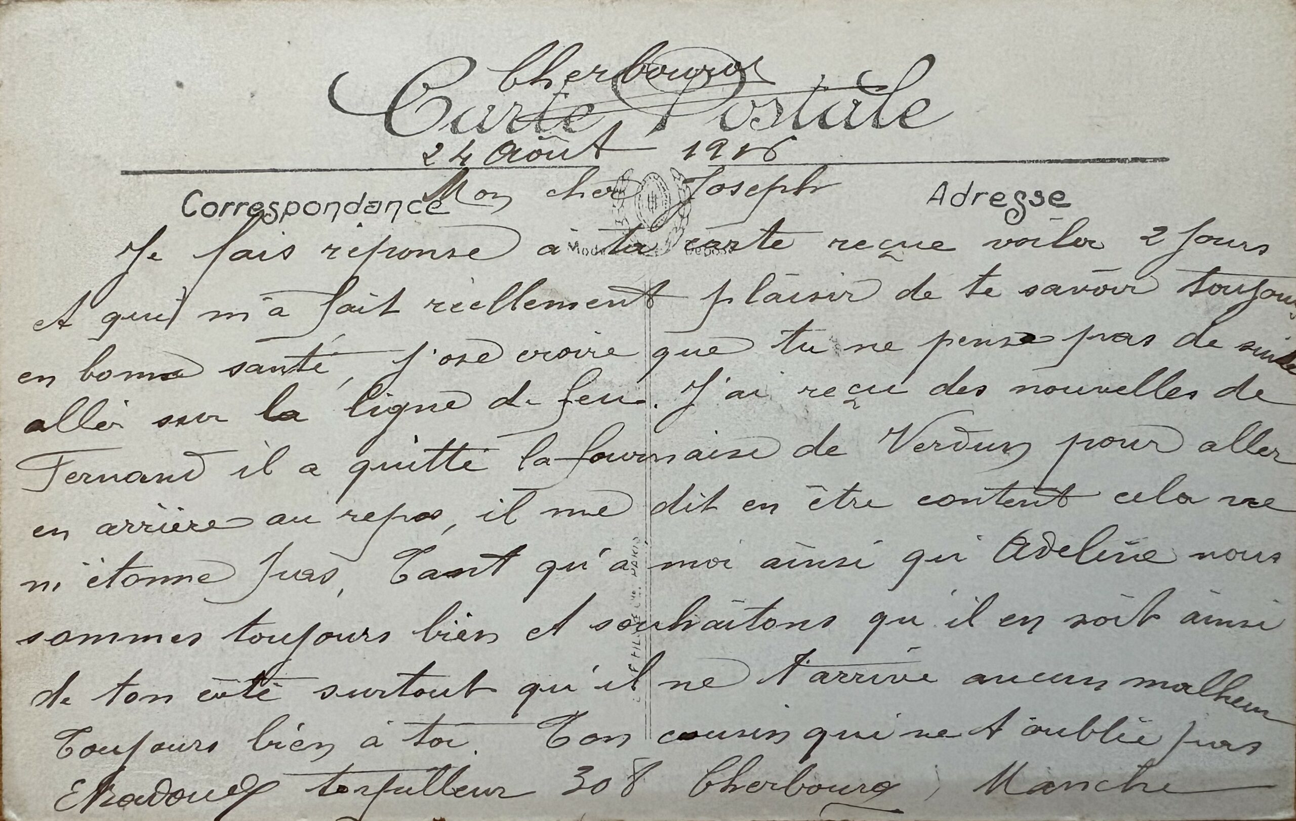 Je fais réponse à ta carte reçue voilà 2 jours et qui m’a fait réellement plaisir de te savoir toujours en bonne santé. J’ose croire que tu ne penses pas de suite aller sur la ligne de feu. J’ai reçu des nouvelles de Fernand ; il a quitté la fournaise de Verdun pour aller en arrière au repos. Il me dit en être content, cela ne m’étonne pas. tant qu’à moi ainsi qu’Aveline, nous sommes toujours bien et souhaitons qu’il en soit ainsi de ton côté, surtout qu’il ne t’arrive aucun malheur. Toujours bien à toi. Ton cousin qui ne t’oublie pas.