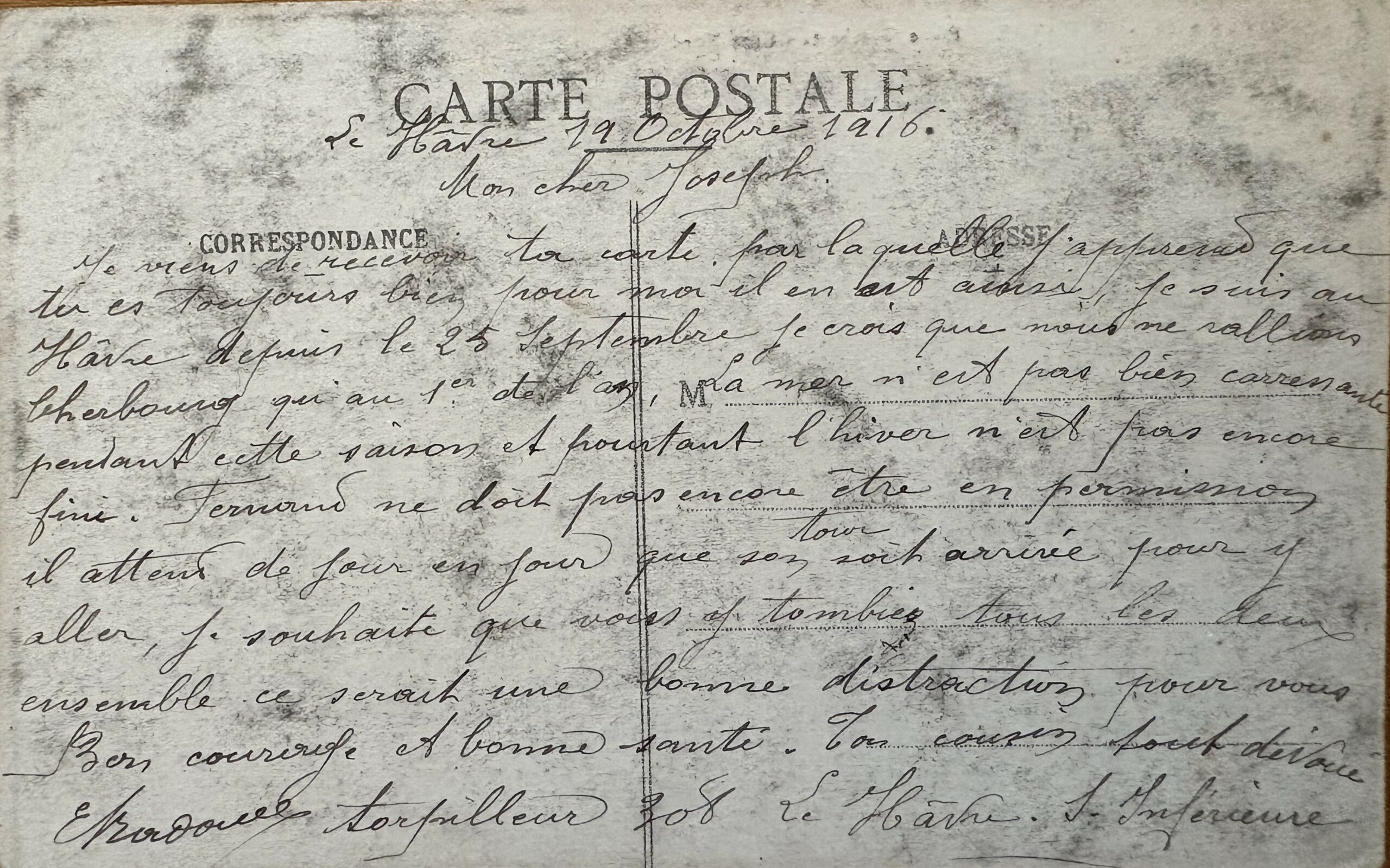Je viens de recevoir ta carte par laquelle j’apprends que tu es toujours bien ; pour moi, il en est ainsi, je suis au Havre depuis le 25 Septembre. je crois que nous ne rallions Cherbourg qu’au 1er de l’an. La mer n’est pas bien caressante pendant cette saison et pourtant, l’hiver n’est pas encore fini. Fernand ne doit pas encore être en permission. Il attend de jour en jour que son tour soit arrivé pour y aller. Je souhaite que vous y tombiez tous les deux ensemble. Ce serait une bonne distraction pour vous. Bon courage et bonne santé. Ton cousin tout dévoué.