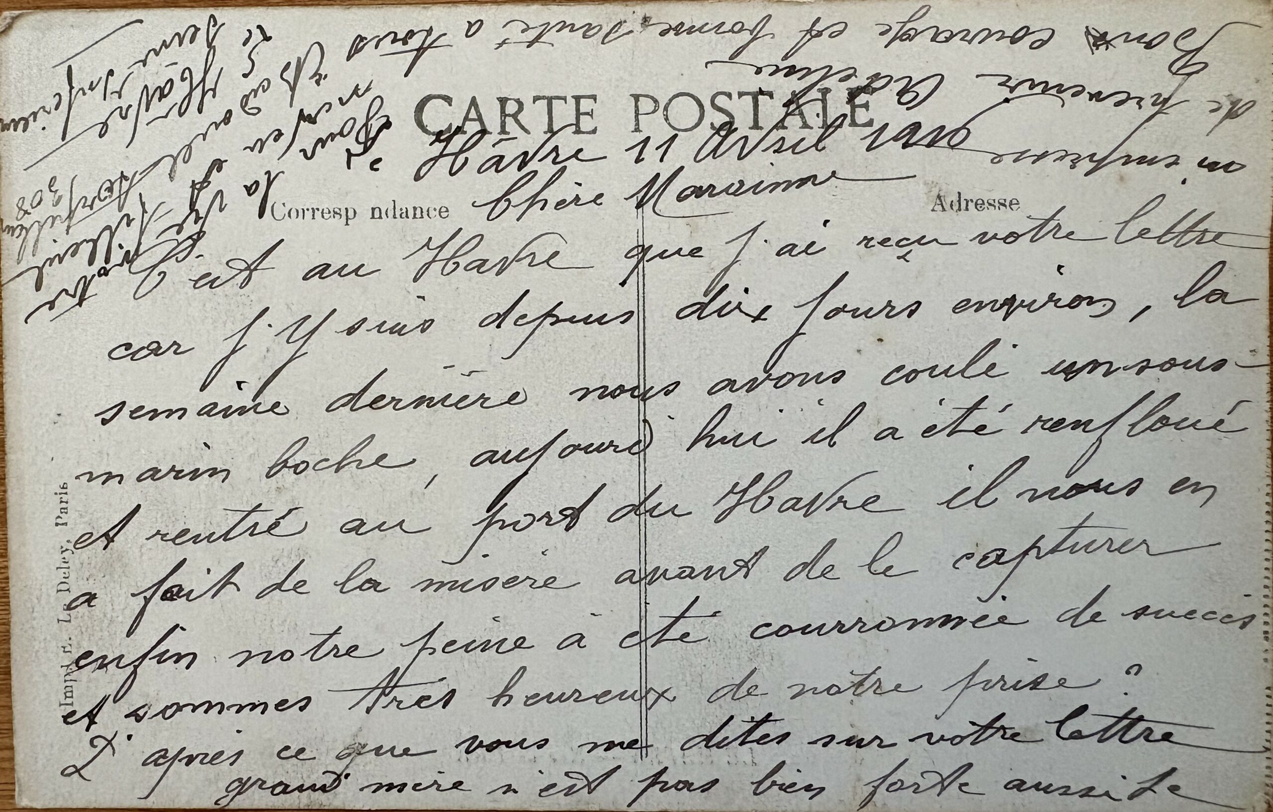 C’est au Havre que j’ai reçu votre lettre car j’y suis depuis dix jours environ. La semaine dernière, nous avons coulé un sous-marin boche. Aujourd’hui, il a été renfloué et rentré au port du Havre. Il nous en a fait des misère avant de le capturer ; enfin, notre peine a été couronné de succès et sommes très heureux de notre prise. D’après ce que vous me dites sur votre lettre, grand-mère n’est pas bien forte aussi je m’empresse de terminer. Bon courage et bonne santé à tous.
