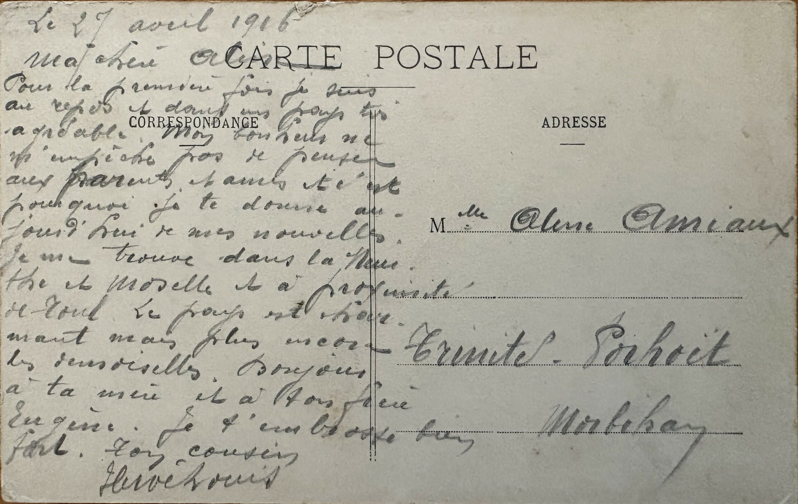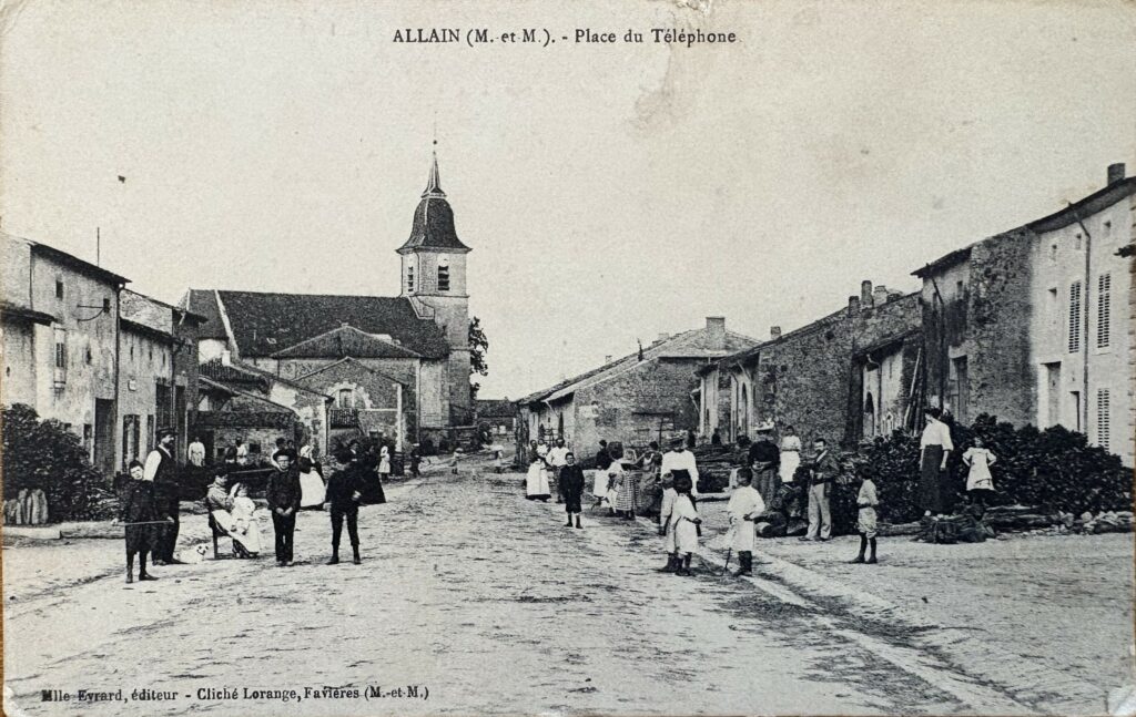 Allain (Meurthe et Moselle), le 27 avril 1916. Ma chère Aline, Pour la première fois, je suis en repos dans un pays très agréable. Mon bonheur ne m’empêche pas de penser aux parents et amis et c’est pourquoi je te donne aujourd’hui de mes nouvelles. Je me trouve dans la Meurthe et Moselle à proximité de Toul. Le pays est charmant mais plus encore les demoiselles. Bonjour à ta mère et à ton frère Eugène. je t’embrasse bien fort.