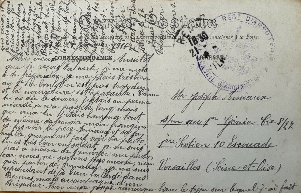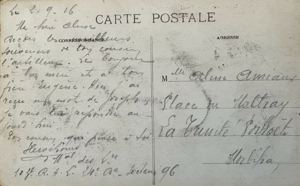 Le 2 septembre 1916. Maréchal des Logis, 103e R.A.L, 24e Bataillon, secteur 96. Ma chère Aline, Reçois les meilleurs souvenirs de ton cousin l’artilleur. Le bonjour à ta mère et à ton frère Eugène. Hier, j’ai reçu un mot de Joseph ; je vais lui répondre aujourd’hui. Ton cousin qui pense à toi.
