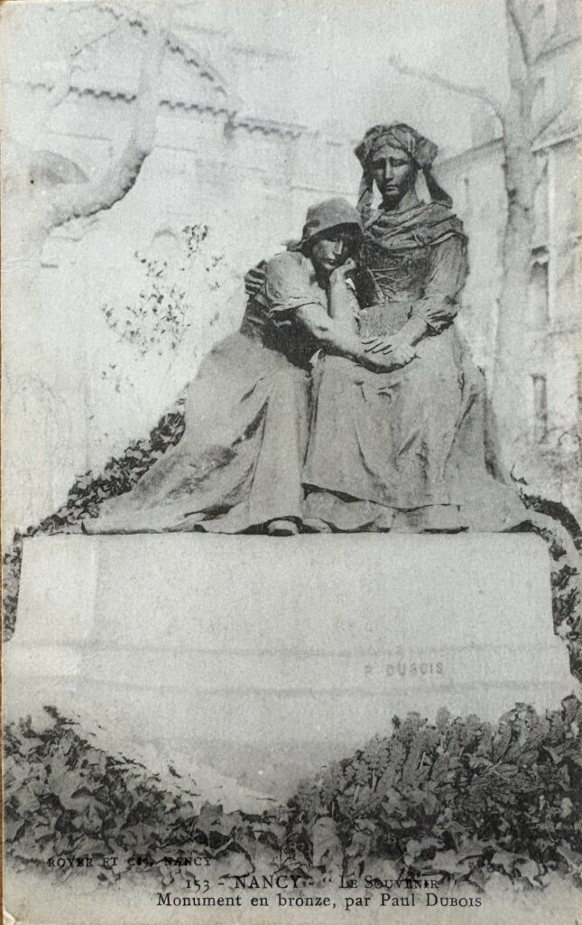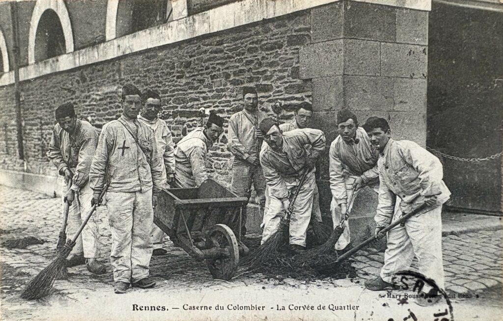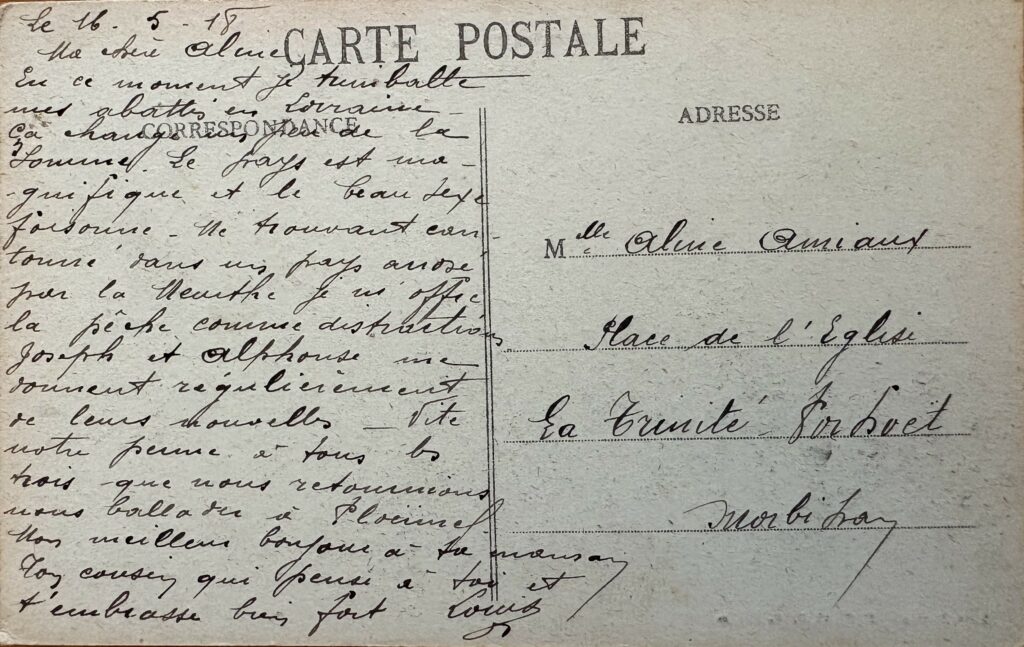 Ma chère Aline, En ce moment, je trimballe mes abattis en Lorraine ; ça change un peu de la Somme. Le pays est magnifique et le beau sexe foisonne. Me trouvant cantonné dans un pays arrosé par la Meurthe, je m’offre la pêche comme distraction. Joseph et Alphonse me donnent régulièrement de leurs nouvelles. Vite notre perme à tous ; les trois que nous retournions nous balader à Ploërmel. mon meilleur bonjour à ta maman. Ton cousin qui pense à toi et t’embrasse très fort.