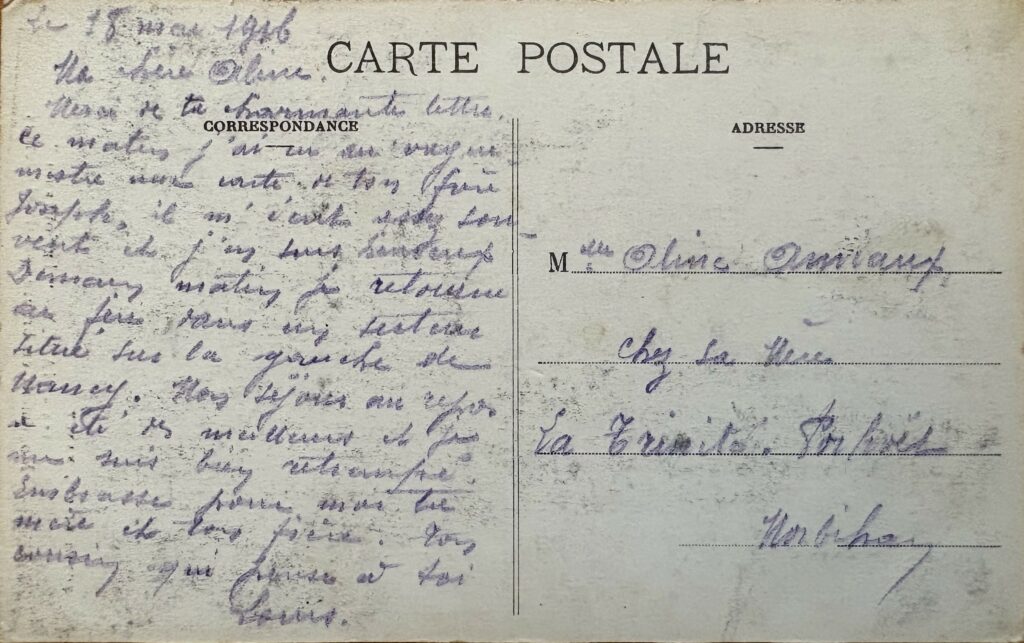 Nancy, le 18 mai 1916. Ma chère Aline, Merci de ta charmante lettre, ce matin j’ai envoyé un vaguemestre à ton frère Joseph, il m’écrit assez souvent et j’en suis heureux. Demain matin je retourne au feu sur un secteur situé sur la gauche de Nancy. Mon séjour au repos a été des meilleurs. Embrasse pour moi ta mère et ton frère. Ton cousin qui pense bien à toi. Louis.