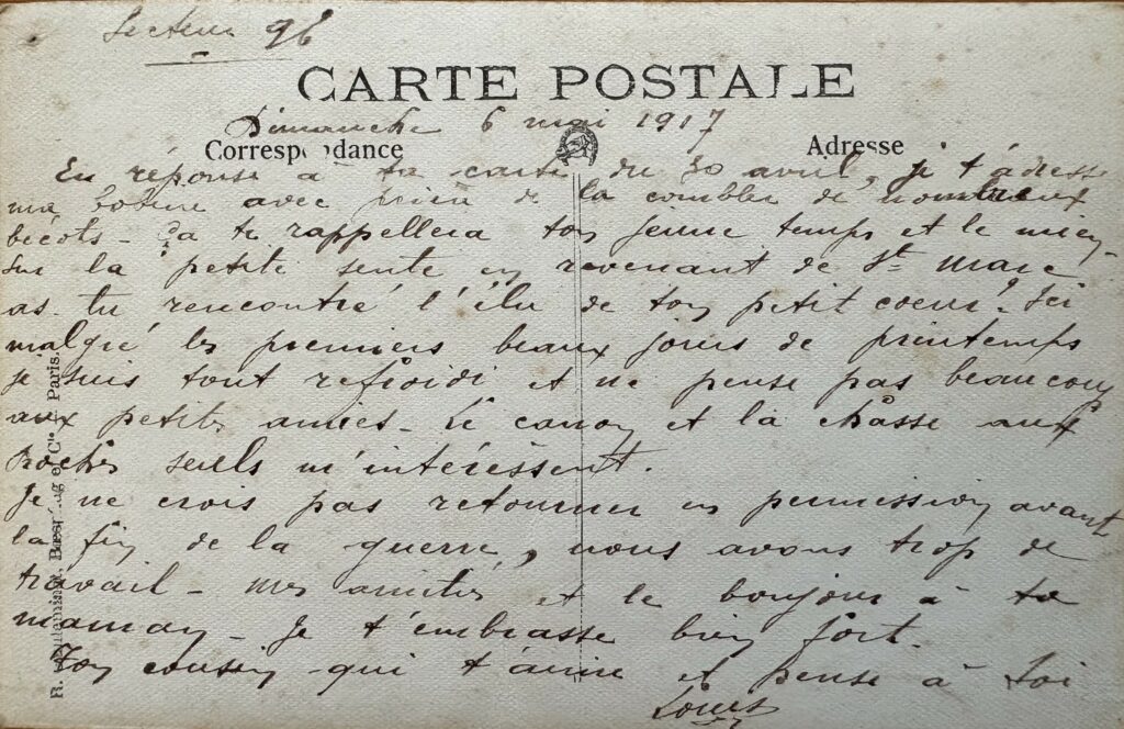 Secteur 96, le 06 mai 1917. En réponse à ta carte du 30 Avril, je t’adresse une bobine avec prière de la combler de nombreux bécots ; ça te rappelleras ton jeune temps et le mien sur la petite sente en revenant de St Marc. As-tu rencontré l’élu de ton petit cœur ? Ici, malgré les premiers beaux jours de printemps, je suis tout refroidi et ne pense pas beaucoup aux petites amies. Le canon et la chasse aux boches, seul, m’intéresse. Je ne crois pas retourner en permission avant la fin de la guerre. Nous avons trop de travail. Mes amitiés et le bonjour à ta maman. Je t’embrasse bien fort. Ton cousin qui t’aime et pense à toi.