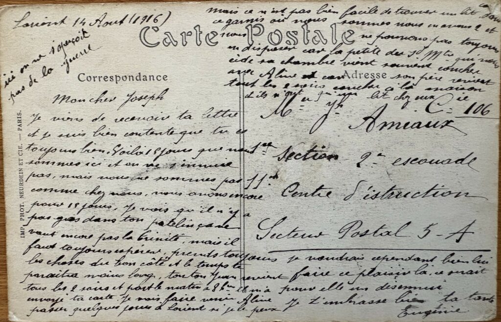 Lorient (Morbihan), le 14 août 1916. Mon cher Joseph, Je viens de recevoir ta lettre et suis bien contente que tu vas toujours bien. Voilà quinze jours que nous sommes ici et on ne s’ennuie pas comme chez nous. Nous avons encore pour quinze jours. Je vois qu’il n’y a pas gros dans ton patelin, ça ne vaut pas la Trinité ; mais il faut toujours espérer. prends toujours les choses du bon côté et le temps te paraîtra moins long. Tonton Jean revient tous les 2 soirs et part le matin à 8 heures. Il m’a envoyé ta carte. je vais faire venir Aline passer quelques jours à Lorient si je le peux ; mais ce n’est pas bien facile de trouver un lit sans ce gamin ; où nous sommes nous en avons deux et nous ne pourrons pas toujours en disposer car la petite du Maître qui nous cède sa chambre vient souvent coucher avec Aline car son frère revient tous les soirs coucher à la maison et ils n’ont qu’un petit lit chez eux. je voudrais cependant bien lui faire plaisir ; là ce serait pour elle un désennui. Je t’embrasse bien.