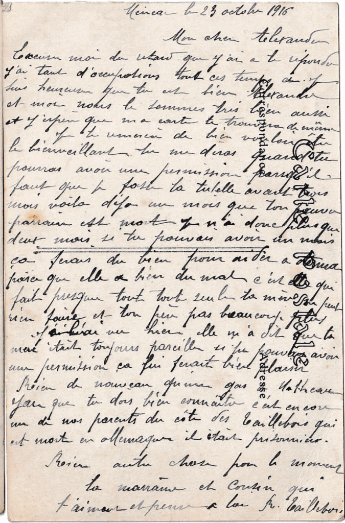 Ménéac, le 23 octobre 1916. Mon cher Alexandre, Excuse moi du retard que j’ai à te répondre. J’ai tant d’occupations tous ces temps ci. Je suis très heureuse que tu es bien. Alexandre et moi, nous le sommes très bien aussi et j’espère que la carte te trouvera de même. Je te remercie de bien vouloir être le bienveillant, tu me diras quand tu pourras avoir une permission parce qu’il faut que je fasse la tutelle avant trois mois, voilà déjà un mois que ton pauvre parrain est mort. Je n’ai donc plus que deux mois. Si tu pouvais avoir un mois, ça ferait du bien pour à … qu’elle a bien du mal, c’est elle qui fait presque tout toute seule, ta mère ne peut rien faire et ton père pas beaucoup plus. Je l’ai vu hier, elle m’a dit que ta mère était toujours pareille, si tu pouvais avoir une permission, ça ferait bien plaisir. Rien de nouveau qu’un gars, JAN (1), que tu dois bien connaître, c’est encore un de nos parents du côté des TAILLEBOIS qui est mort en Allemagne, il était prisonnier. Rien autre chose pour le moment. Ta marraine (2) et (ton) cousin qui t’aiment et pensent à toi. Marie Reine TAILLEBOIS